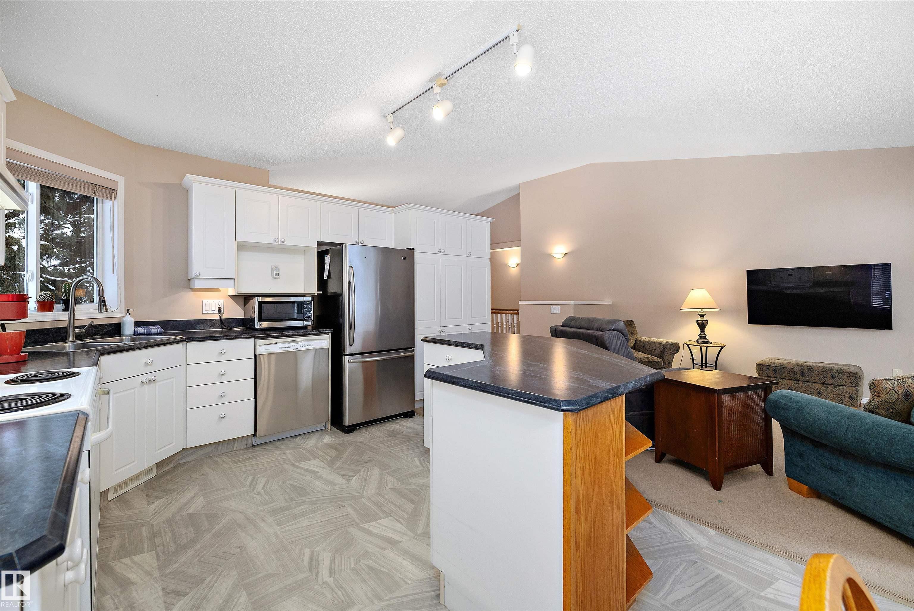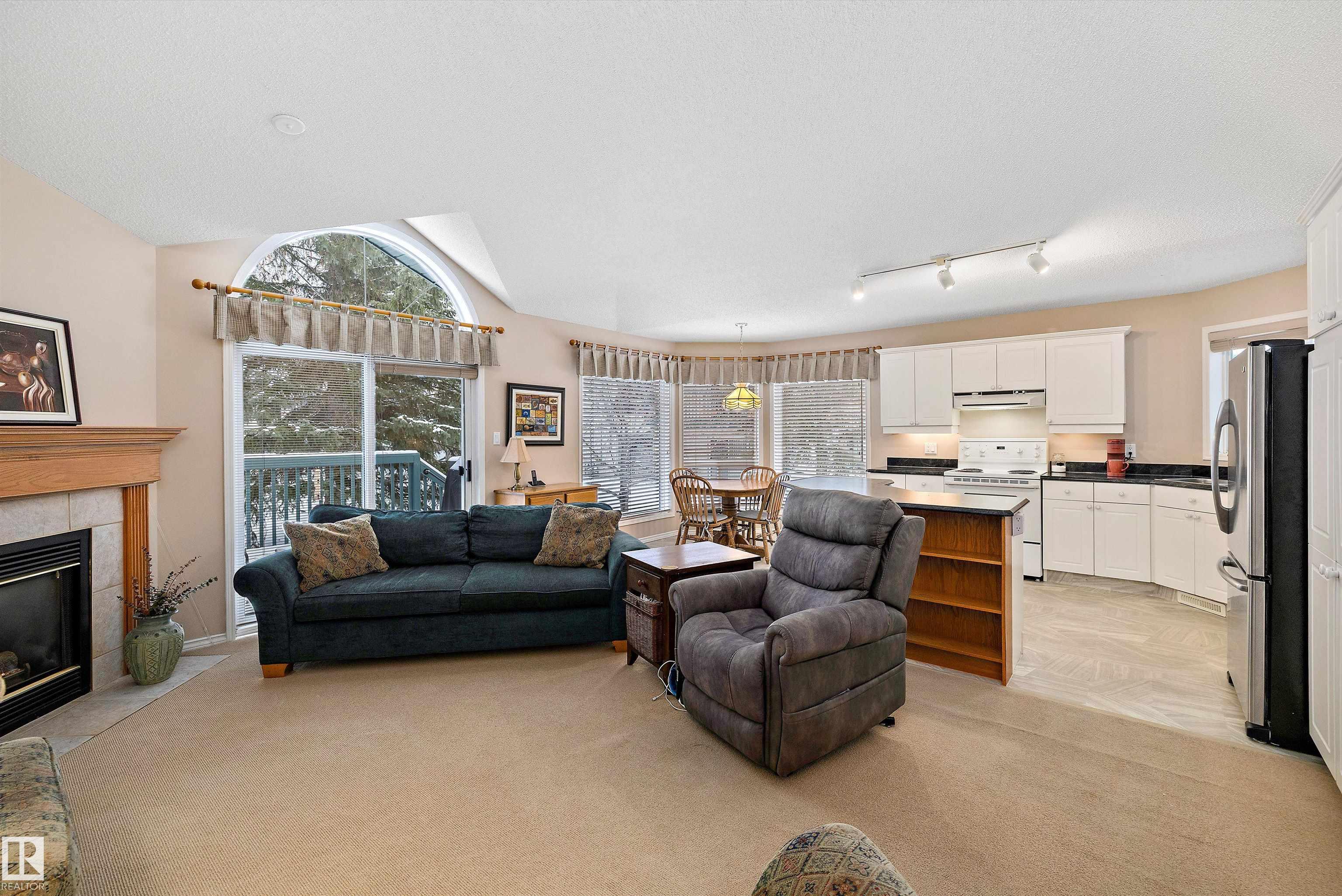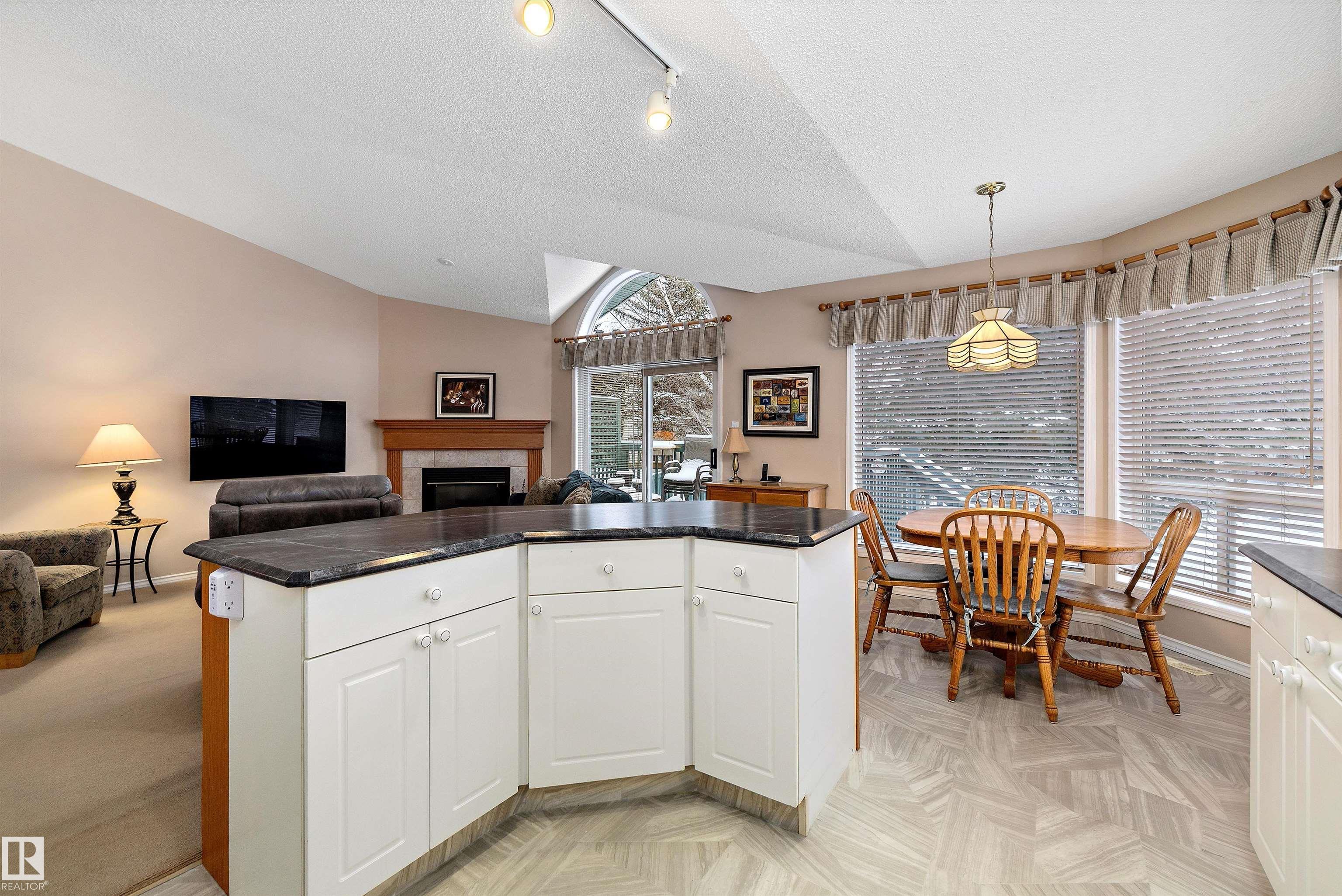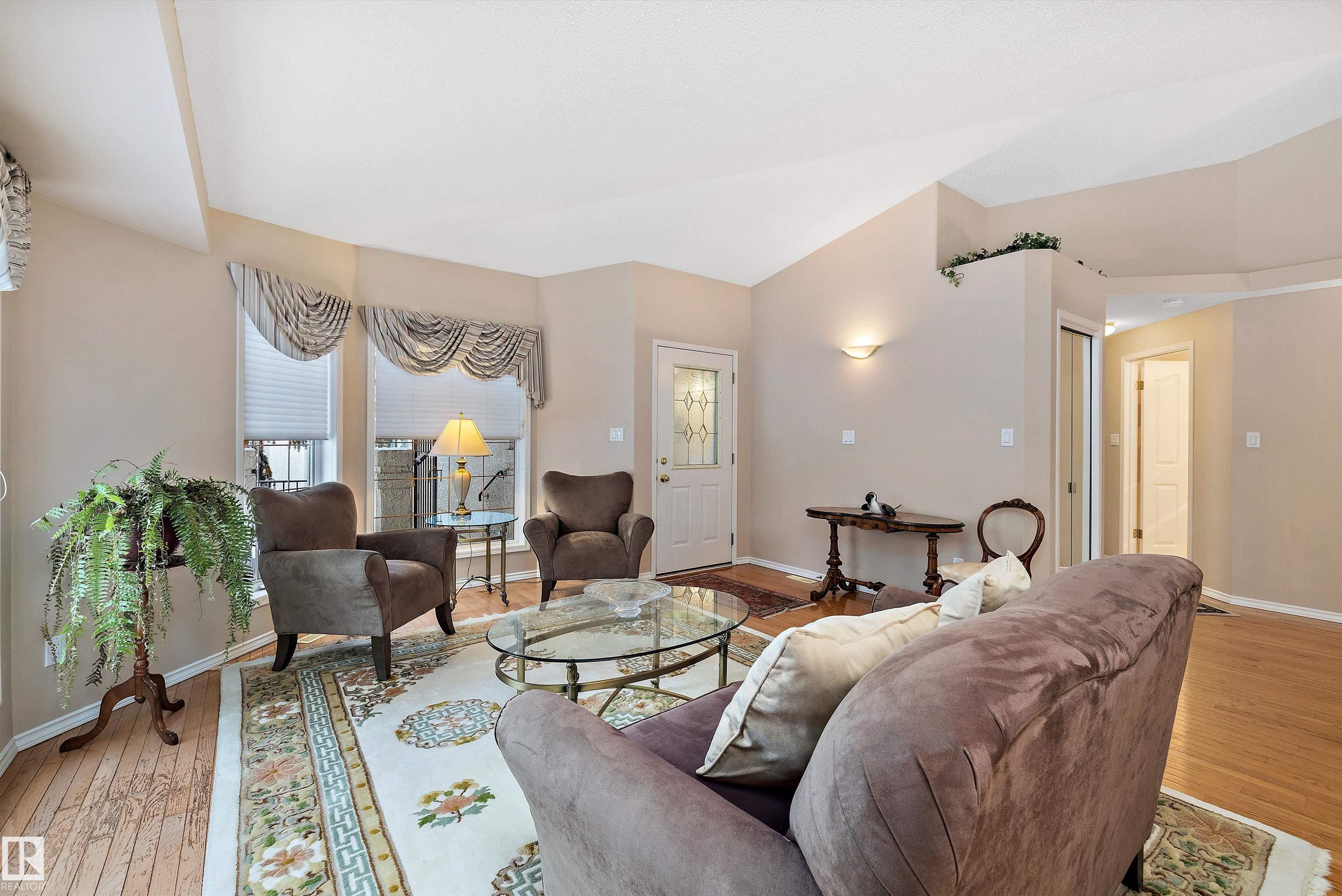This impeccable RIVERBEND bungalow in Riverside Common delivers ADULT, MAINTENANCE-FREE living at its absolute finest! Tucked into a quiet keyhole and backing onto Dry Creek Park, it offers mature trees, peaceful views, and exceptional privacy. Inside, you're greeted by soaring VAULTED ceilings, a sun-soaked south-facing living room, and an inviting open-concept kitchen--perfect for Christmas gatherings or cozy evenings by the TOASTY fireplace. Enjoy summer BBQs on your beautiful private deck, then retreat to an ENORMOUS primary suite complete with a walk-in closet and a wonderfully functional ensuite. The DOUBLE attached garage adds comfort year-round, and you're only steps from transit, a pharmacy, the recreation centre, and the stunning river valley. With quick access to Terwillegar Drive and the Anthony Henday. This private oasis blends convenience with serenity--your ideal next chapter awaits. MLS®: E4467980 - Haddow Bungalow $495,000