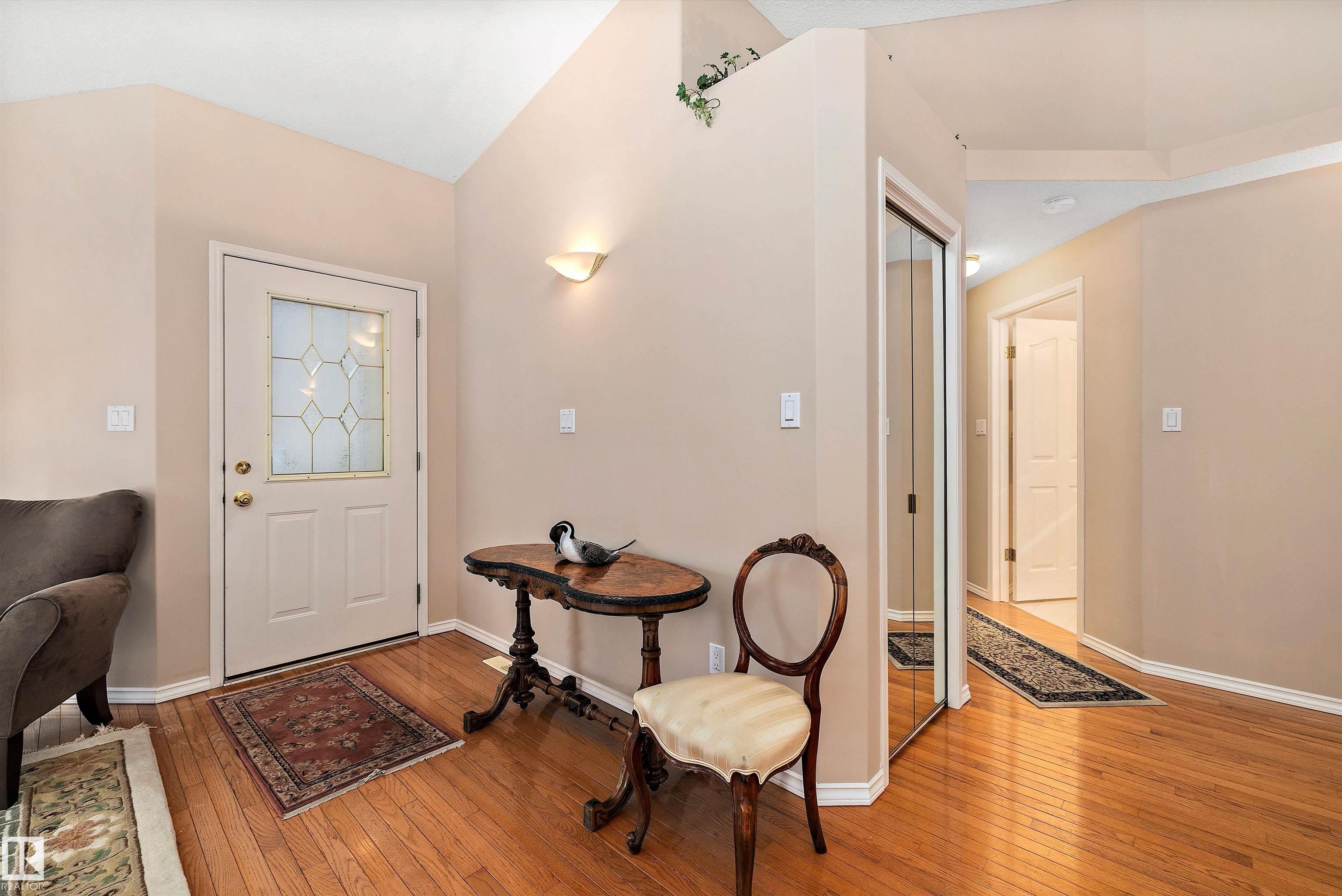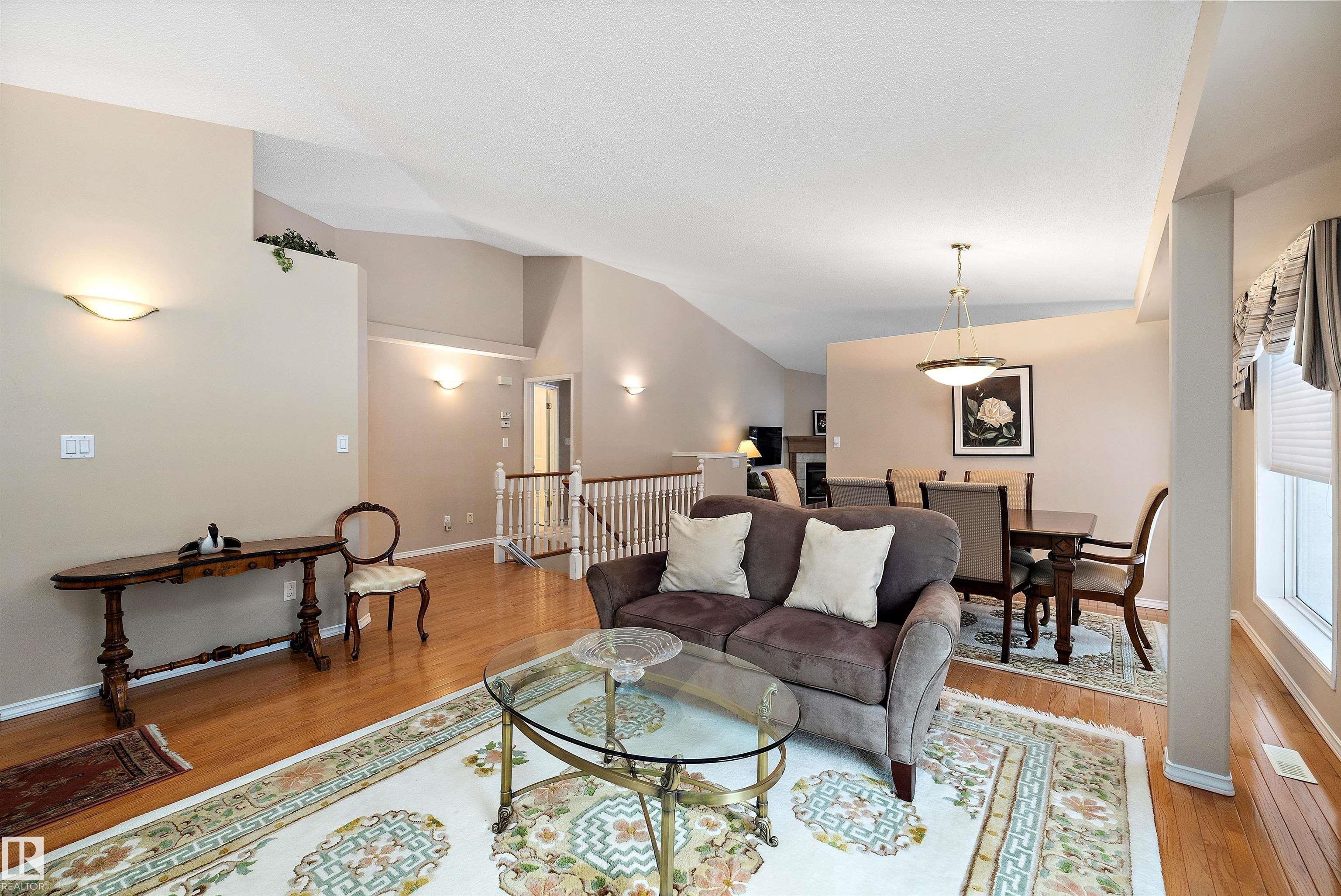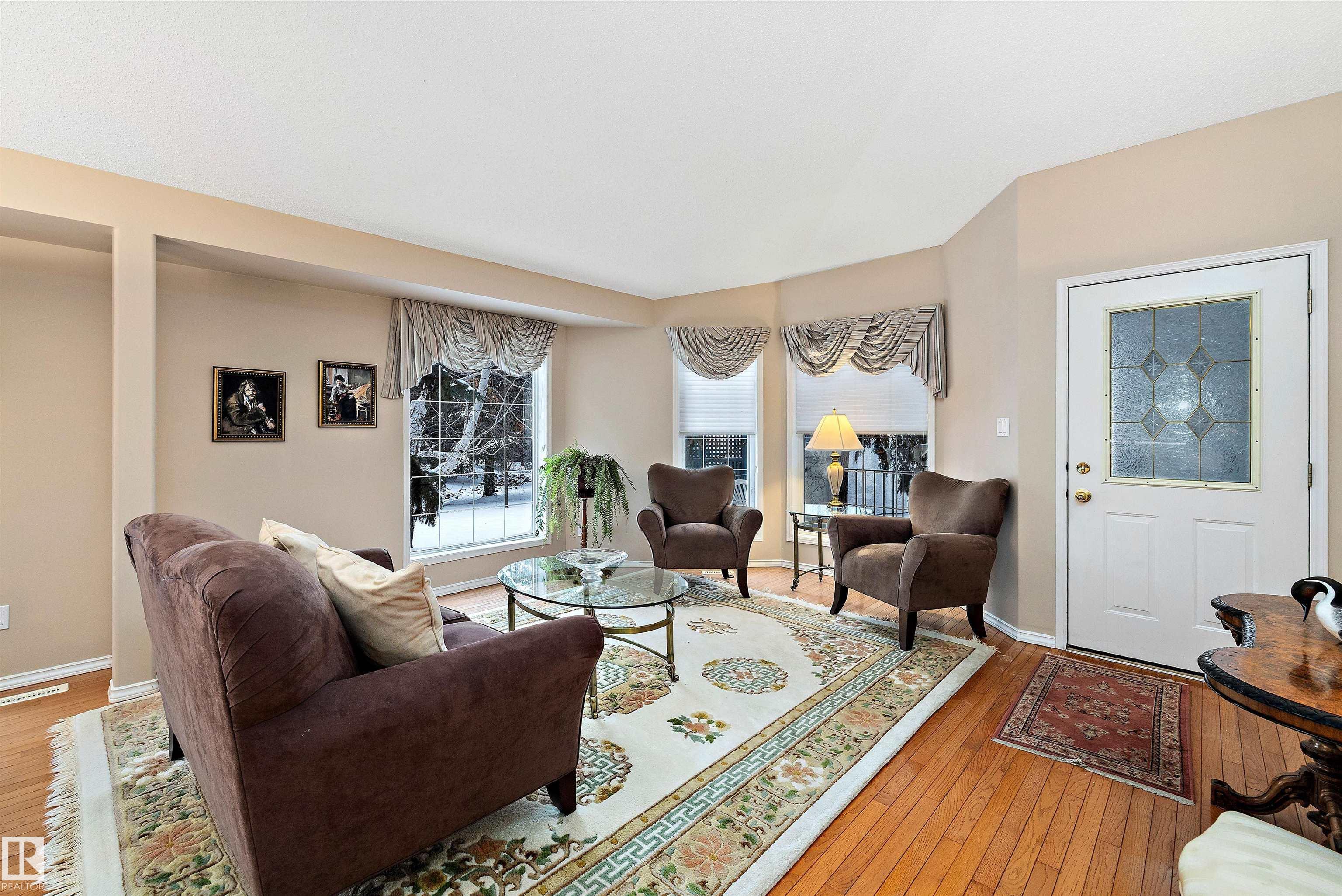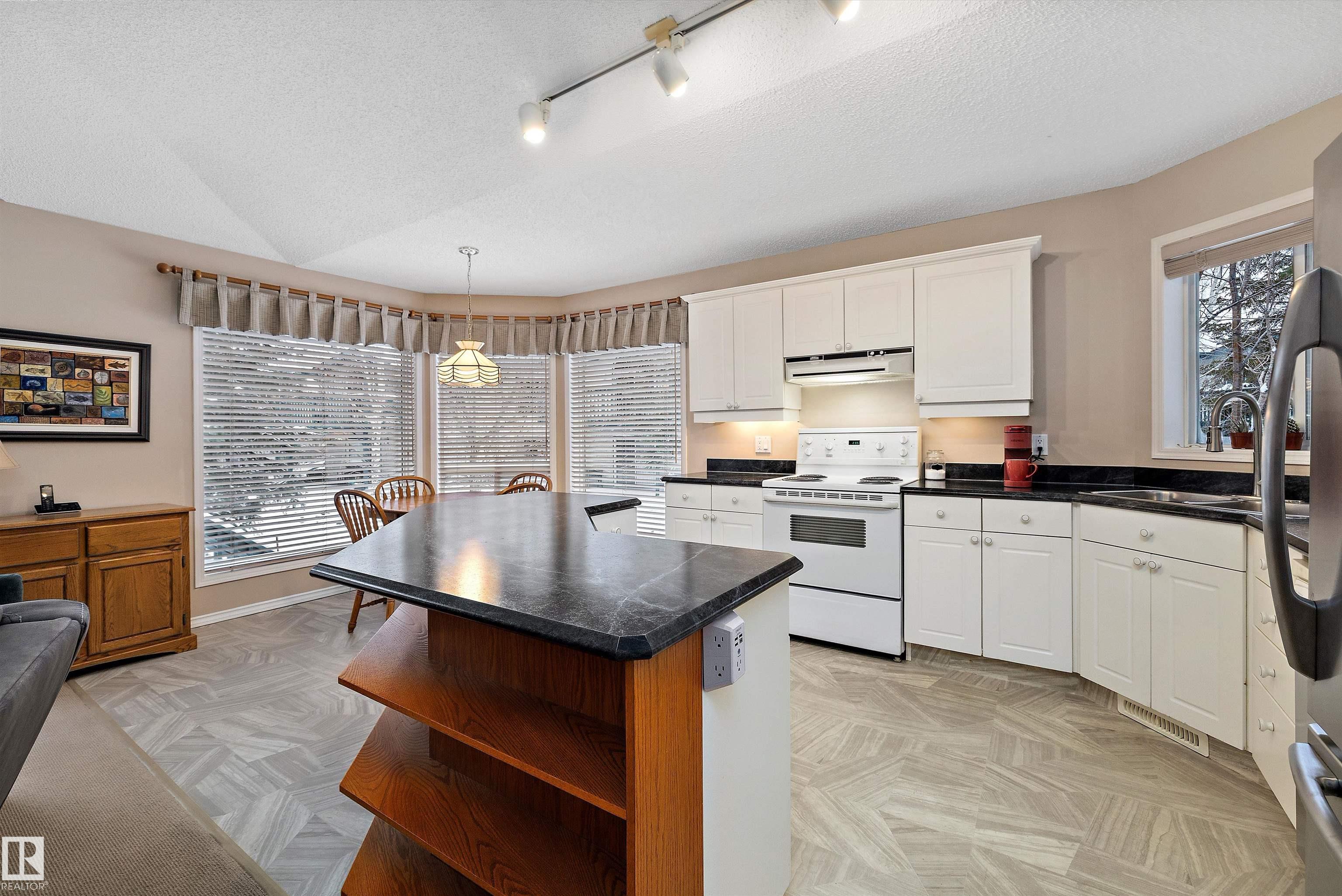 This impeccable RIVERBEND bungalow in Riverside Common delivers ADULT, MAINTENANCE-FREE living at its absolute finest! Tucked into a quiet keyhole and backing onto Dry Creek Park, it offers mature trees, peaceful views, and exceptional privacy. Inside, you're greeted by soaring VAULTED ceilings, a sun-soaked south-facing living room, and an inviting open-concept kitchen--perfect for Christmas gatherings or cozy evenings by the TOASTY fireplace. Enjoy summer BBQs on your beautiful private deck, then retreat to an ENORMOUS primary suite complete with a walk-in closet and a wonderfully functional ensuite. The DOUBLE attached garage adds comfort year-round, and you're only steps from transit, a pharmacy, the recreation centre, and the stunning river valley. With quick access to Terwillegar Drive and the Anthony Henday. This private oasis blends convenience with serenity--your ideal next chapter awaits. MLS®: E4467980 - Haddow Bungalow $495,000